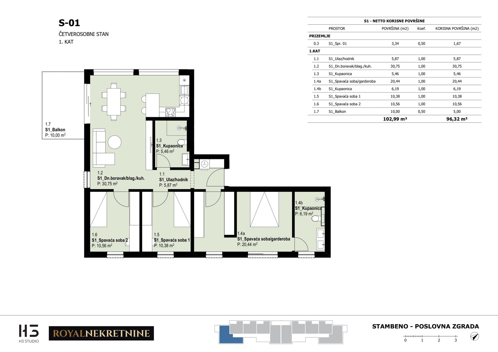 | Stan S1 – 1.kat – 4 sobni – Z3 | 2 | 1 | Ne | 96,53 m² | — | Dostupno | Otvori tlocrt | — |