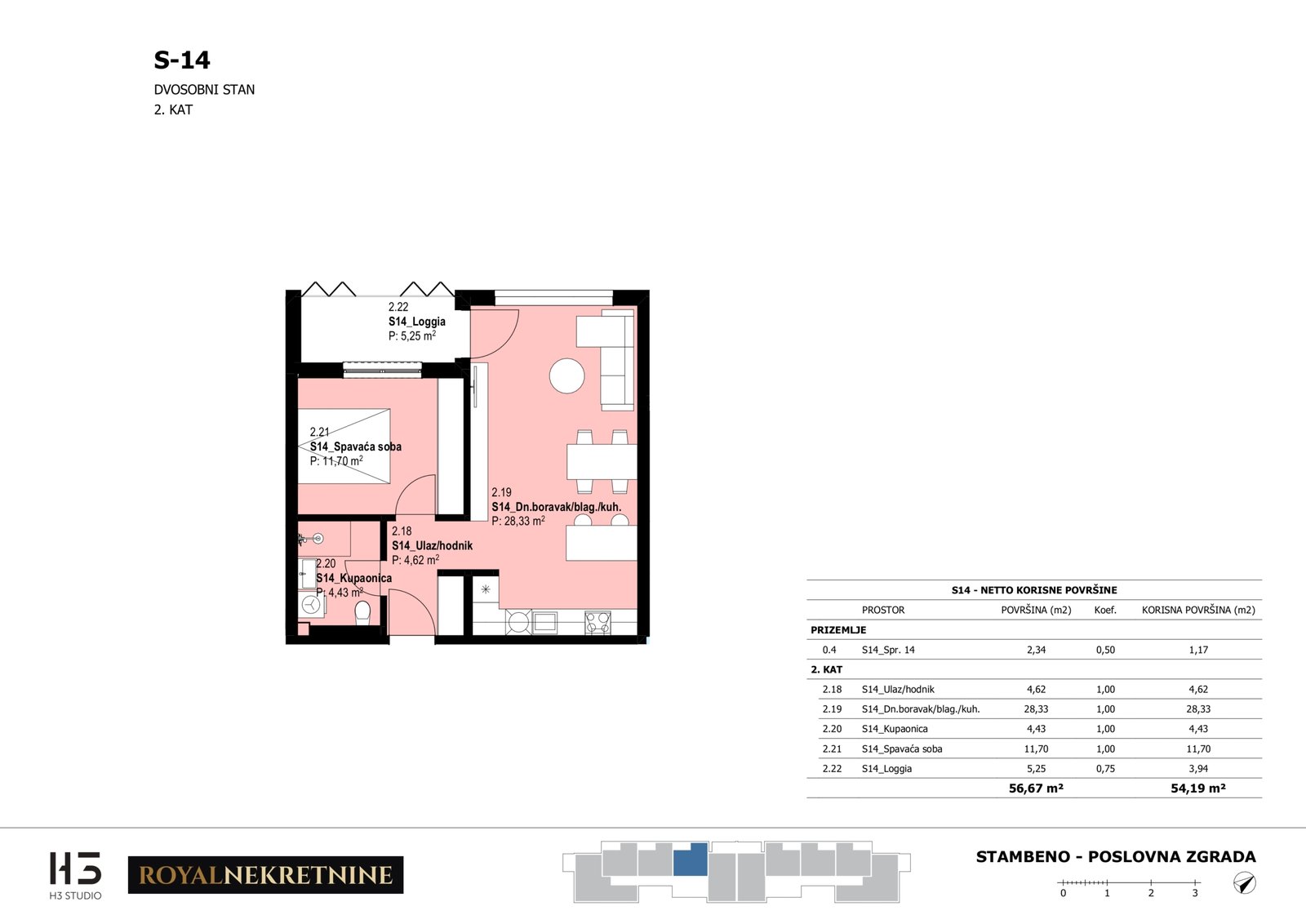 | Stan S14 – 2.kat – 2 sobni – Z3 | 1 | 1 | Ne | 54,56 m² | — | Prodano | Otvori tlocrt | — |