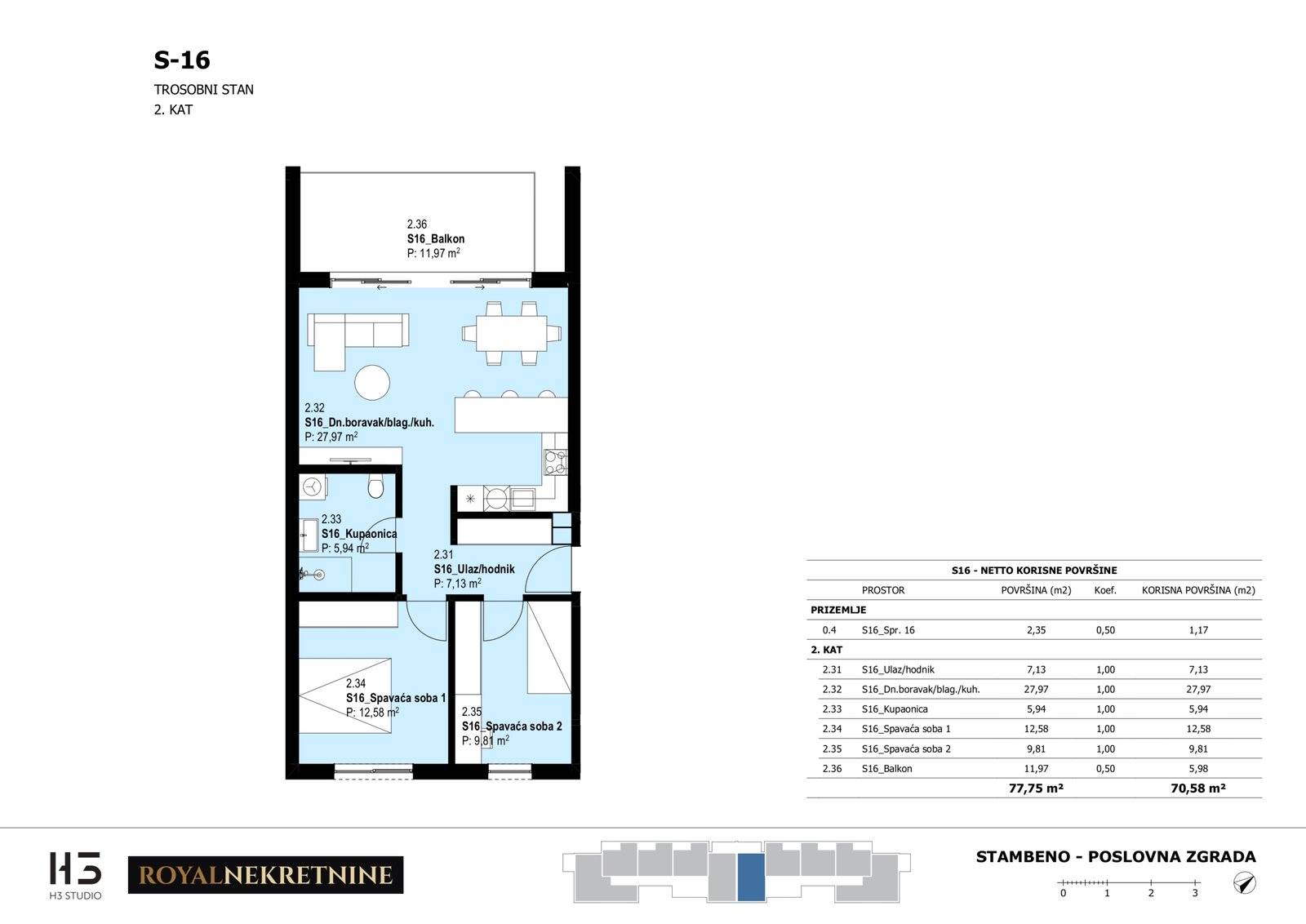 | Stan S16 – 2.kat – 3 sobni – Z3 | 2 | 1 | Ne | 70,81 m² | — | Prodano | Otvori tlocrt | — |