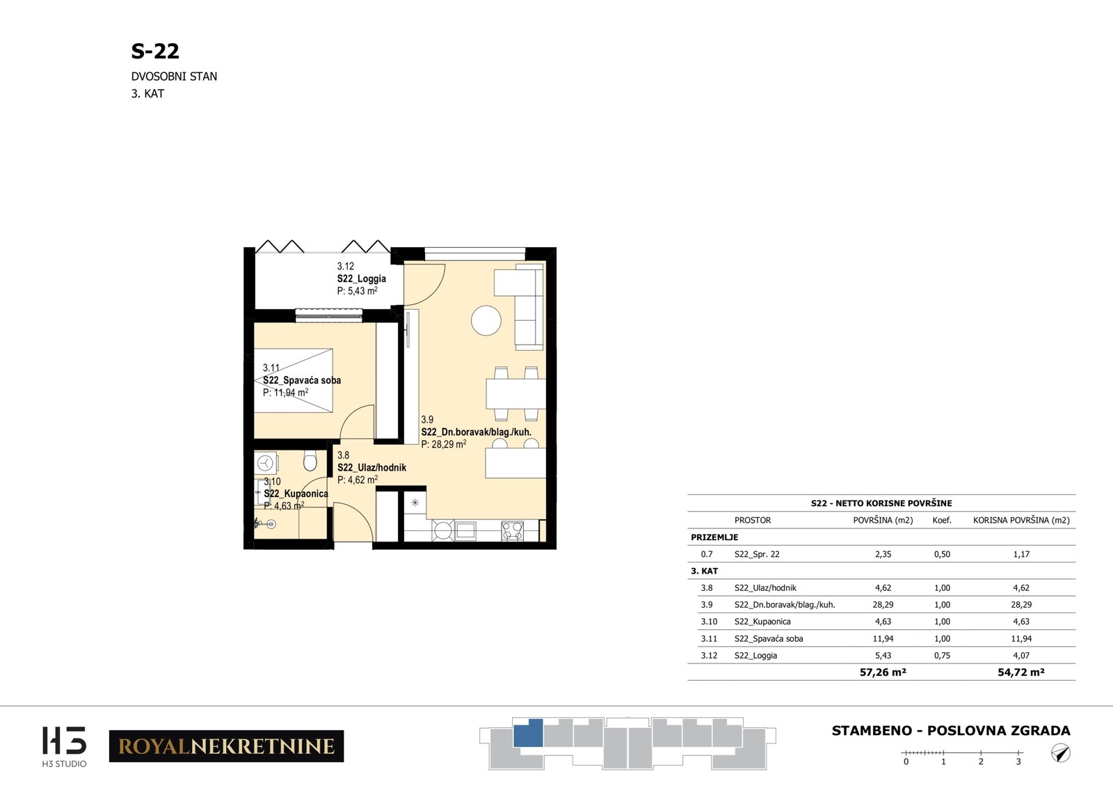 | Stan S22 – 3.kat – 2 sobni – Z3 | 1 | 1 | Ne | 54,92 m² | — | Prodano | Otvori tlocrt | — |
