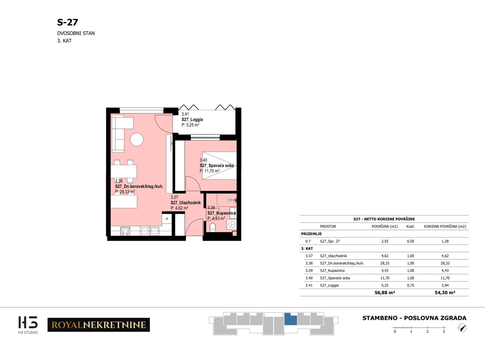 | Stan S27 – 3.kat – 2 sobni – Z3 | 1 | 1 | Ne | 54,67 m² | — | Prodano | Otvori tlocrt | — |