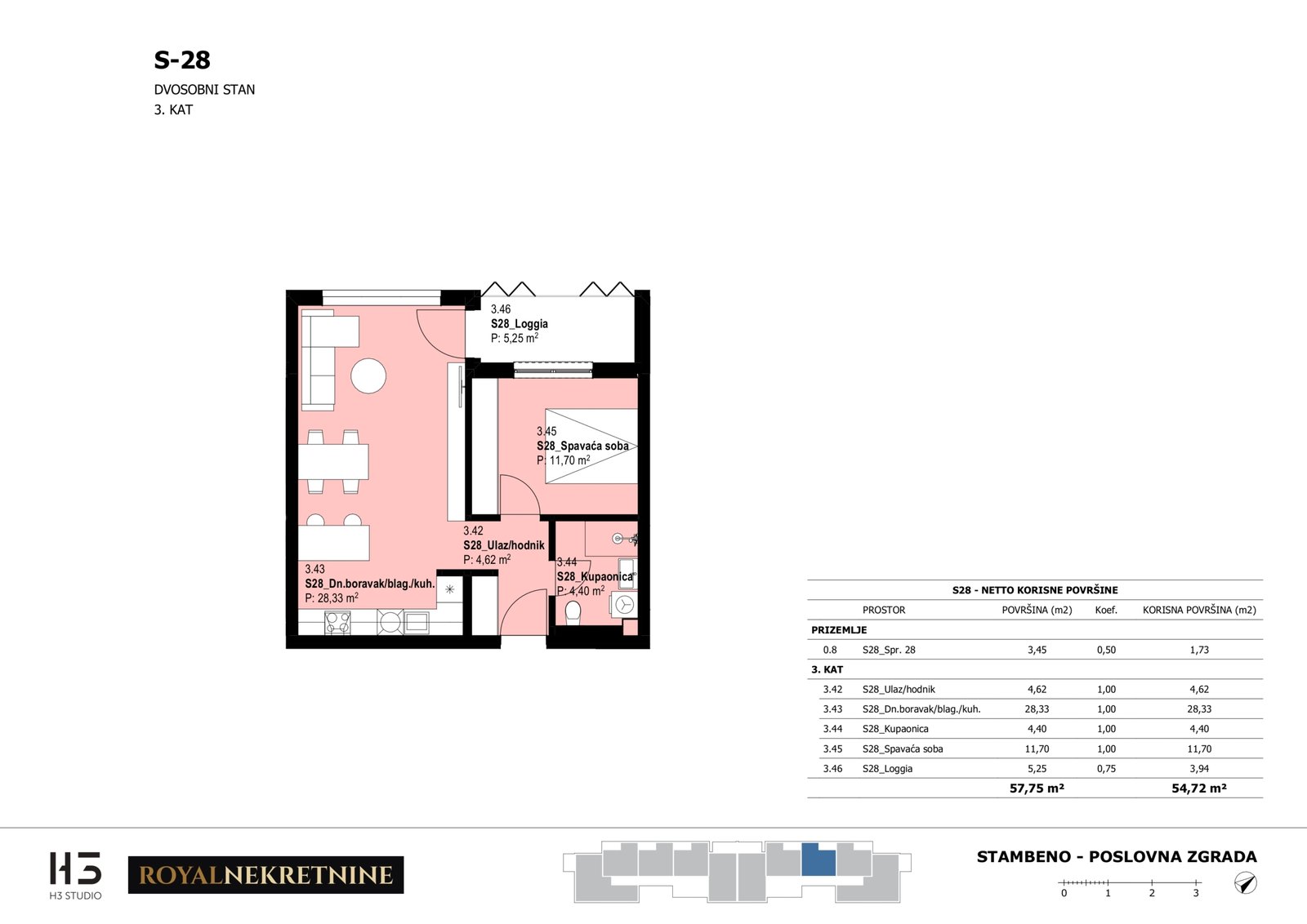 | Stan S28 – 3.kat – 2 sobni – Z3 | 1 | 1 | Ne | 55,12 m² | — | Prodano | Otvori tlocrt | — |
