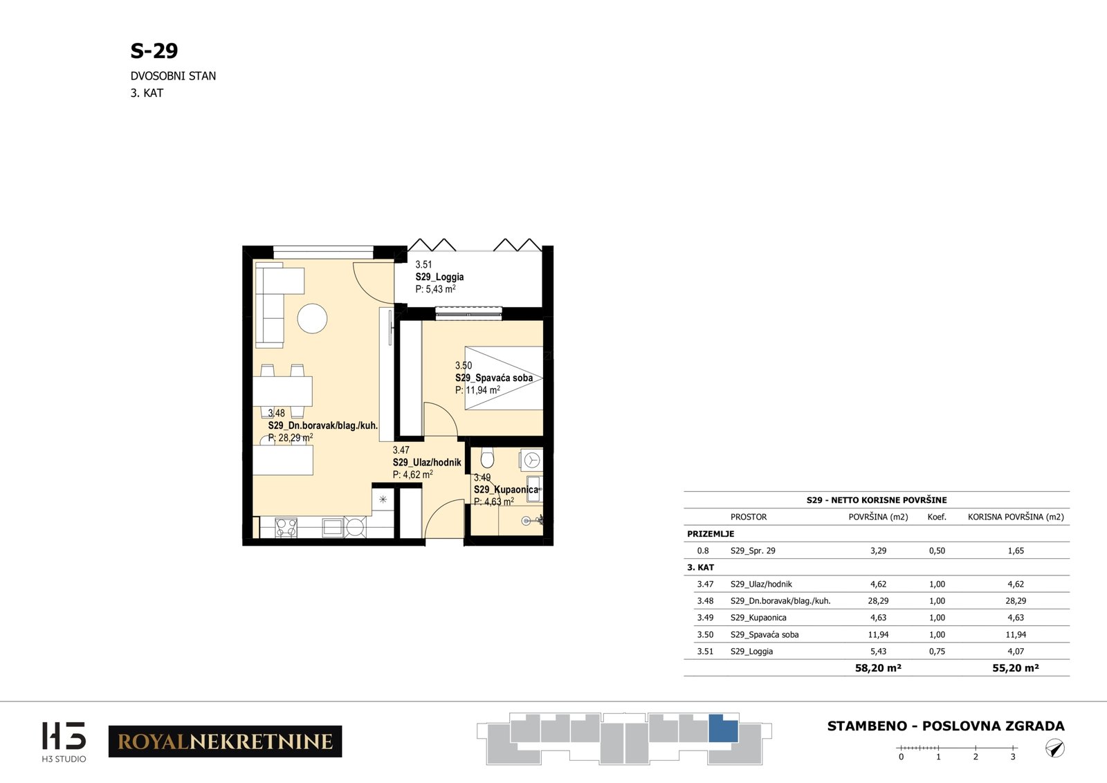 | Stan S29 – 3.kat – 2 sobni – Z3 | 1 | 1 | Ne | 55,40 m² | — | Prodano | Otvori tlocrt | — |