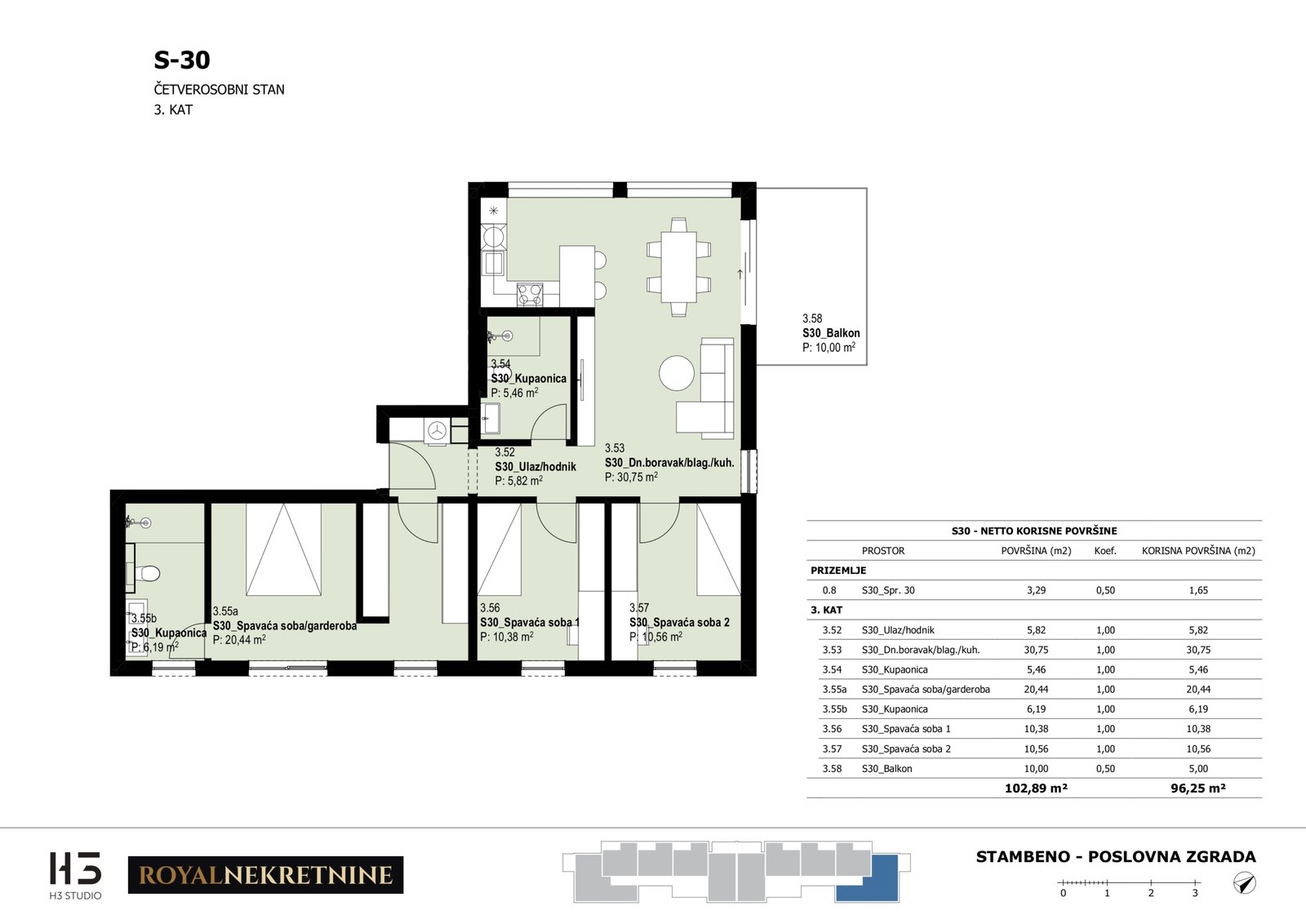 | Stan S30 – 3.kat – 4 sobni – Z3 | 3 | 1 | Da | 96,48 m² | — | Dostupno | Otvori tlocrt | — |
