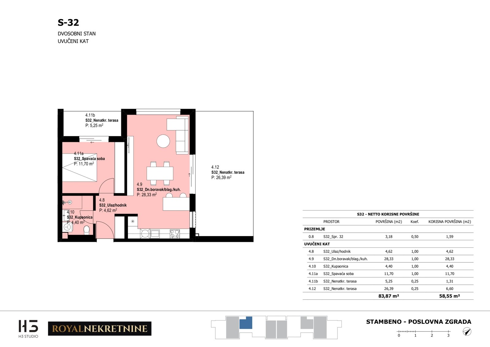 | Stan S32 – Uvučeni kat – 2 sobni – Z3 | 1 | 1 | Ne | 59,17 m² | — | Prodano | Otvori tlocrt | — |