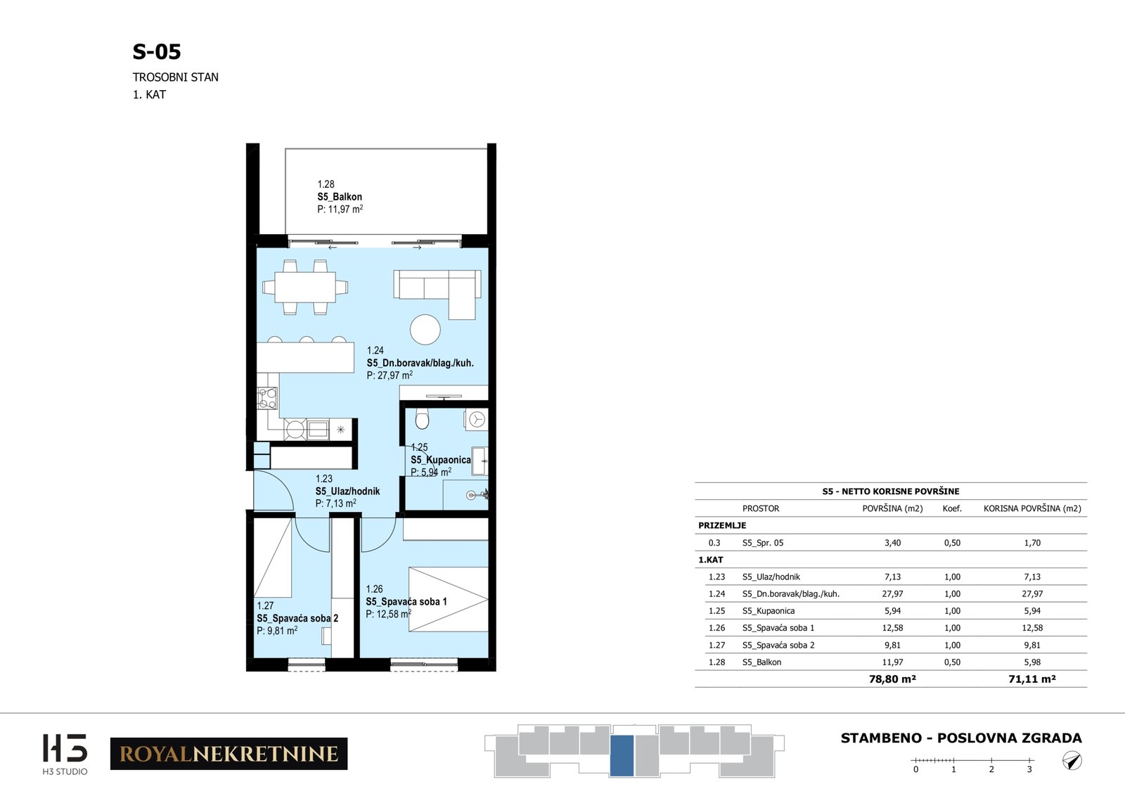 | Stan S5 – 1.kat – 3 sobni – Z3 | 2 | 1 | Ne | 71,34 m² | — | Prodano | Otvori tlocrt | — |