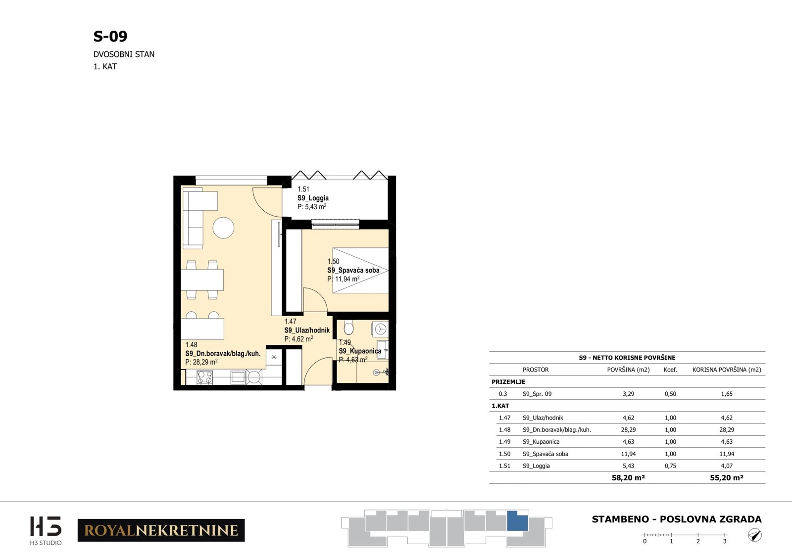 | Stan S9 – 1.kat – 2 sobni – Z3 | 1 | 1 | Ne | 55,40 m² | — | Prodano | Otvori tlocrt | — |